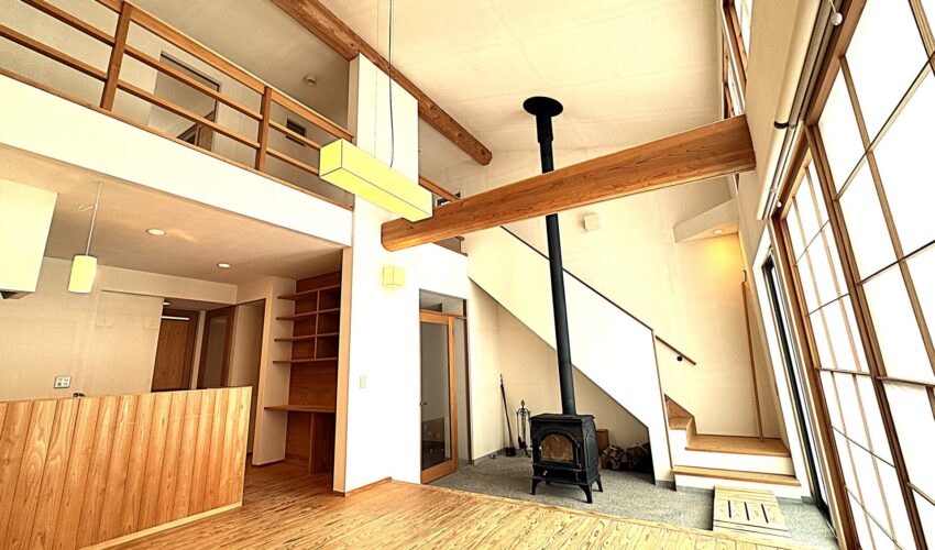 こだわりの邸宅は、2階までの吹抜けに、土間スペースに薪ストーブを備えた、ゆとりある南向きのLDK。 採光と通風に恵まれた、解放感ある特別なこの住空間で、家族一人ひとりがお気に入りの時間を自由に過ごす。
